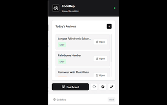 Användare kan installera CodeRep och koppla sitt konto via en API-token. Efter att ha lagt till problem kan de betygsätta svårighetsgraden efter varje genomgång, vilket hjälper till att optimera nästa revisionsschema. Med en ren och överskådlig instrumentpanel kan användare enkelt följa sin framgång och säkerställa att de aldrig glömmer ett LeetCode-problem igen.